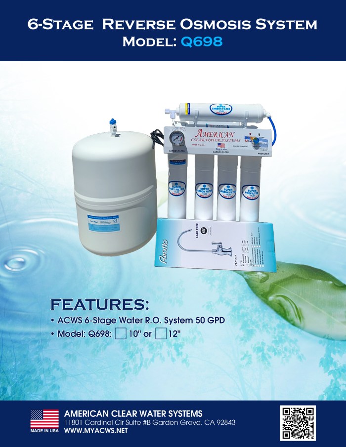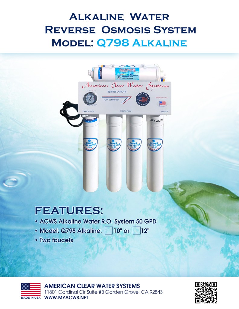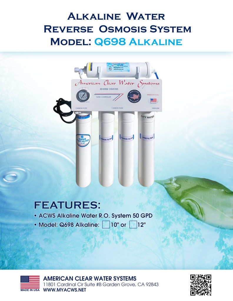 Enjoy fresh, great tasting pH+ mineral water right at home that is perfect for drinking, cooking and making delicious coffee, tea and ice. ACWS 5 stage to 7 stages guaranteed to remove up to 99% of harmful water contaminants such as chlorine, taste, odor, VOCs, as well as toxic fluoride, arsenic, lead, nitrates, heavy metals, and much more. Save money, time, and hassle from buying costly bottled water, and live healthier with alkalized, calcium mineral drinking water. ACWS Top Tier R.O. Systems mineral cartridge adds only 100% US-made high-purity calcium carbonate to effectively raise pH in the water for those who desire alkaline water. Other re-mineralization RO systems will claim to add various beneficial minerals back into the water; however, their mineral formulations are often from unknown and uncertified sources that can lead to potential health concern. ACWS Built on top of Q698, the 6 stage Q698 is put through the same rigorous quality control process and offers the same contaminant rejection rating. At 50 GPD, the included DOW FILMTEC membrane provides fastest production rate for a large family who prefers the highest quality water possible. Based in the U.S. with 2 decades of experience in RO design and production, ACWS Water is committed in producing top performing systems that provides trouble-free, high quality drinking water for many years to come.